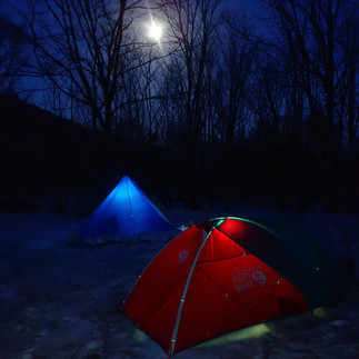 川の流れの向こうには、天狗原山と金山。いつものキャンプサイトの積雪量も少なめ。